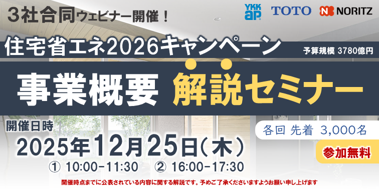 【YKK AP・TOTO・ノーリツ 共同開催】令和7年11月28日(金)の「住宅の省エネ化への支援強化策(令和7年度補正予算案の閣議決定)」をうけて、環境省・経済産業省・国土交通省の3省で同時発表された ..